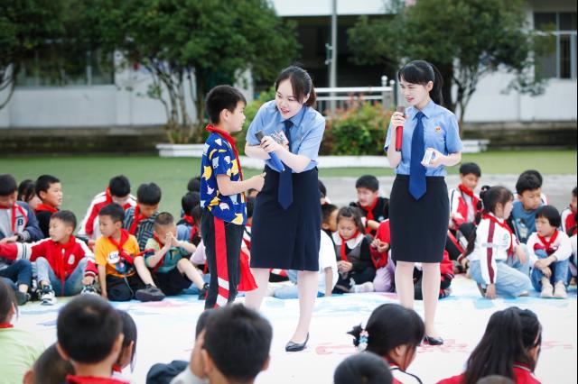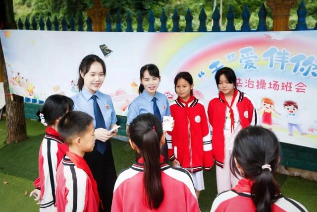 “我爱上班会,学法好处妙,保护你、保护我,长大要做守法好榜样......”在一阵阵改编版《班会课》的歌声里,孩子们跳着手势舞,这场为同学们量身开设的,集“双向”+“互动”+“沉浸”于一体的“法治操场班会”正式拉开序幕。